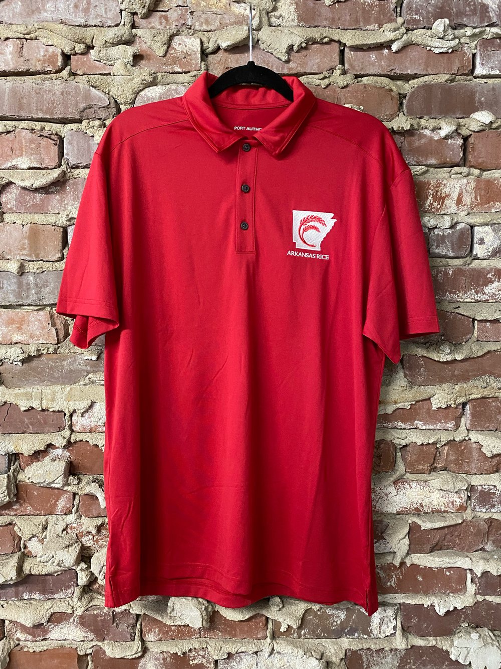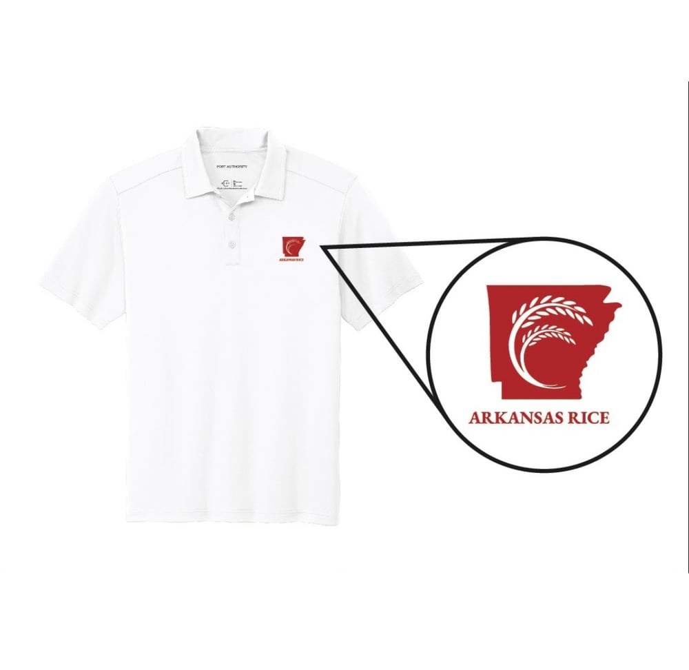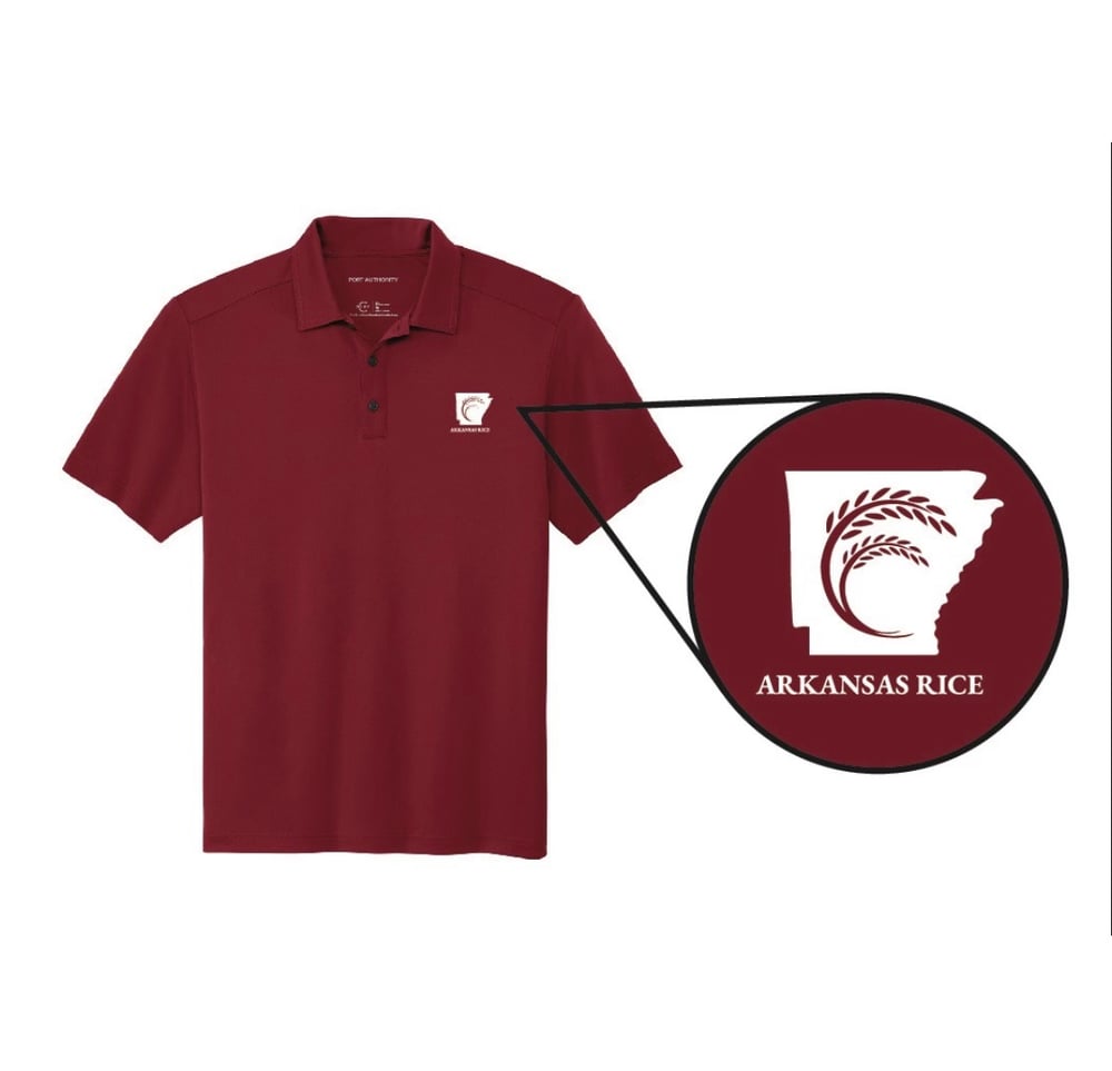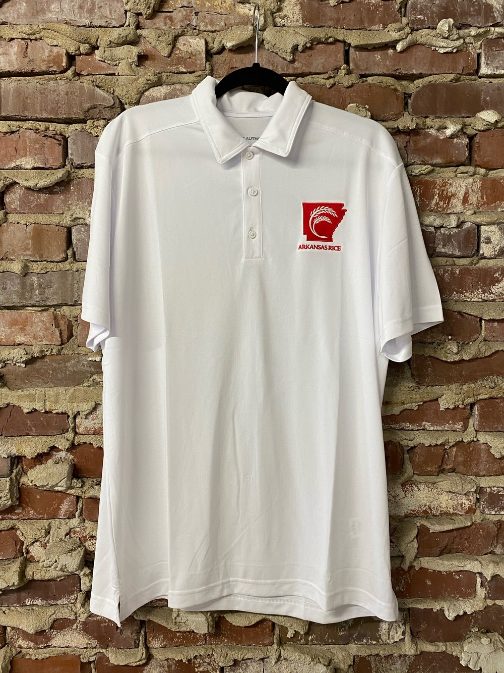 Men's short sleeve golf shirt. Choose dark red or white shirt. Embroidered with Arkansas Rice logo.