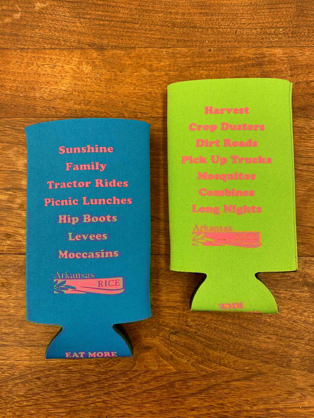 Fun bright colored koozies. Holds your favorite slim can beverages! Printed on both sides plus the bottom area says Eat More Rice!